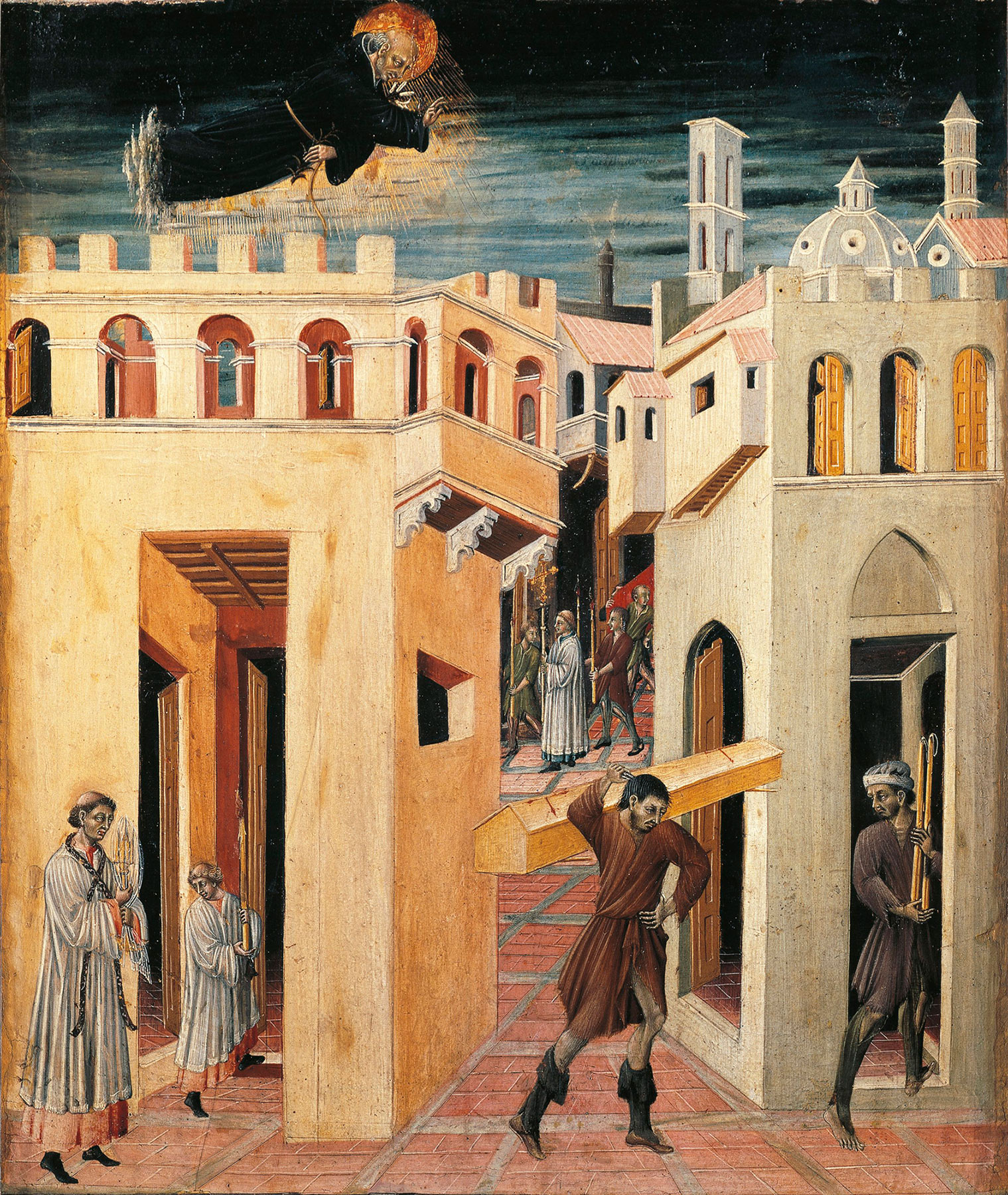 Suggestions for dating the Compagnia degli Artisti predella fragments have consistently gravitated around the decade of the 1450s. In first associating the Attempted Martyrdom of Saint John the Evangelist (see fig. 1) with this group, Pope-Hennessy assigned it a date of 1450–55, relating it to the Saint Nicholas scenes in Philadelphia and Vienna (which he thought could be dated 1453) as evidence of “Giovanni di Paolo’s close observation at this time of ordinary life.”21 Although Brandi rejected this identification, he assigned roughly the same date (“il complesso, già a Montepulciano, va datato a circa il 1449–53” [the complex, formerly in Montepulciano, dates to ca. 1449–53]) to the two panels he believed could be part of the Compagnia degli Artisti group, the Baptism (see fig. 2) and the Crucifixion, both at Oxford.22 When he added the Lehman Saint John the Evangelist Raising Drusiana (see fig. 4) to the predella, Pope-Hennessy revised his dating slightly later, noting that the architectural setting in the Lehman panel recalled that in the Saint Catherine predella of 1461 or later.23 Strehlke noted that the Saint Nicholas of Tolentino altarpiece in the church of Sant’Agostino is dated 1457, and he presumed, therefore, that Giovanni di Paolo was in Montepulciano in that year.24 He suggested a date between 1457 and 1461 for the Compagnia degli Artisti altarpiece, on both circumstantial and stylistic grounds.