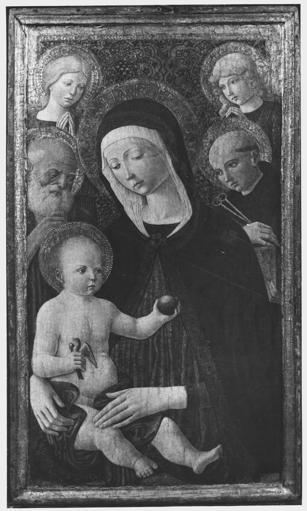 The panel support, a single plank with a vertical wood grain, retains its original thickness of 4 centimeters. The lateral edges at the back are both beveled, possibly to accommodate irregularities of the tree trunk from which it was cut. The back is gessoed and painted as fictive marble. Two holes drilled into the top edge and top center of the back held a hanging strap. Engaged frame moldings, 1 centimeter thick, are preserved around three sides of the panel but are missing at the bottom, which is much consumed by wood worm and water(?) damage. The once-elaborate gilding on the panel is abraded and disfigured by large areas of complete loss to the right of center at the top of the composition, at the left side of the Virgin’s halo, and through the front of her richly tooled dress. The paint surface was extensively “burned” by caustic solvents, above all in the Virgin’s blue mantle and along the edges of raised craquelure in the Christ Child’s body, the Virgin’s face, and the face of the angel at the upper right. A large knot in the panel beneath the Virgin’s forehead has provoked further damage in that area. Although the visual integrity of the image is entirely compromised by the network of losses and exposed gesso and wood, the paint that does survive is rich in color and texture, currently muted by a flat synthetic varnish that lends a parched look to the surface.