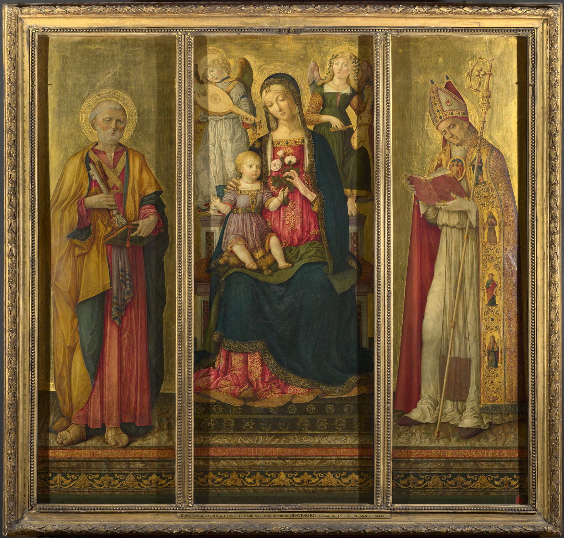 Completed with Joni’s restorations, the painting elicited no doubts in the early literature referring to it. Richard Offner, in a 1925 lecture at Maitland Fuller Griggs’s home, declared it a fine example of Benvenuto di Giovanni’s work.2 Piero Misciattelli, perhaps misled by the rounded proportions of all the figures, preferred to see it as a work by Girolamo di Benvenuto closely dependent on his father’s style, a prime example of the confusion that can arise in distinguishing between the two artists.3 Bernard Berenson, too, listed the painting as by Girolamo di Benvenuto working in his father’s shop,4 an opinion repeated by Raimond van Marle.5 Following its cleaning at Yale in 1953, the painting has regularly been recognized as by Benvenuto di Giovanni, although Charles Seymour, Jr., hesitantly referred it to the artist’s workshop, and Maria Cristina Bandera consigned it to a catalogue appendix, stating that while Benvenuto’s authorship is “probable,” dating the picture is problematic.6 Indeed, few opinions about dating have been ventured. Burton Fredericksen and Darrell Davisson and Serena Gunther suggested the period 1475–78—that is, about the time of Benvenuto’s Montepertuso altarpiece of 1475 and before his large triptych in the National Gallery, London (fig. 2), dated 1479.7 Seymour opted for a date in the following decade, and Carl Strehlke, presumably following the logic of Girolamo di Benvenuto’s known period of activity in his father’s workshop, suggested a date in the 1490s.8