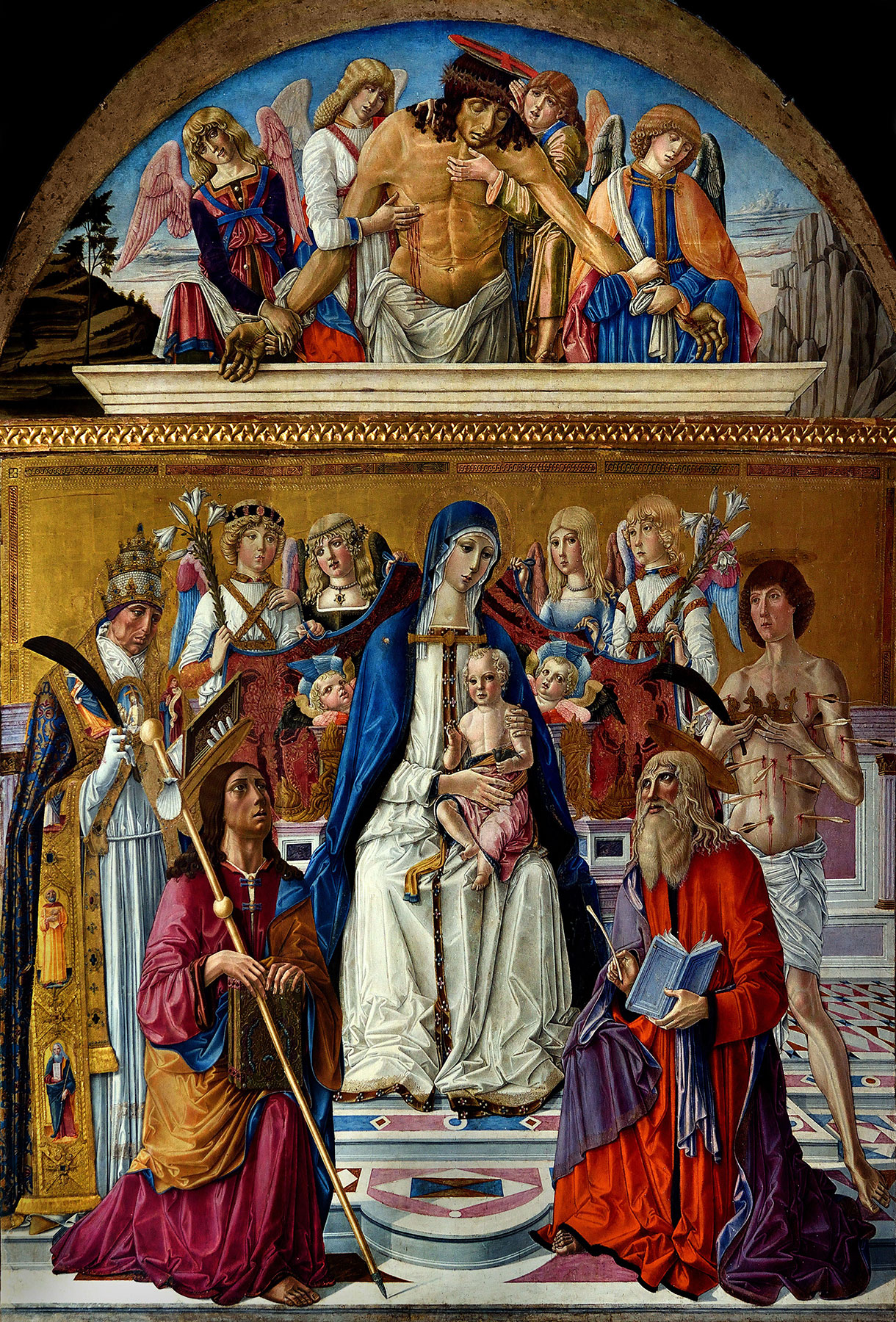 One problem with assessing the probable date of the Borghesi altarpiece is the stylistically heterogeneous nature of the various fragments associated with it in scholarly reconstructions. Two sets of full-length and half-length saints (for the latter, see Benvenuto di Giovanni, Saint Peter Martyr) frequently identified as the pilasters and predella, respectively, of the missing altarpiece frame must be assignable to two different periods of Benvenuto’s career. They have in common nothing more than the occurrence of a selection of Dominican saints among their number. Even more misleading is the relationship of the main panel of the altarpiece to the lunette, representing the Dead Christ supported in His tomb by angels (see fig. 3), associated with it in San Domenico since the early nineteenth century. The lunette has clearly been cut down from a larger structure to match approximately the overall width of the main panel beneath it. It is also evidently a work of the 1480s, much closer in style to the 1491 Ascension altarpiece from Sant’Eugenio than is any other work by Benvenuto putatively of the 1470s. The question must be posed whether the lunette was originally part of another work, possibly of Benvenuto’s 1483 Bellanti altarpiece (the rest of which is not known to survive), and was amalgamated instead to the Borghesi altarpiece at a later date. Considering the two panels as stylistically coeval makes it impossible to date either or to relate independent works to the resultant hybrid structure. Separating them, by contrast, enables the main panel to be recognized as a midterm between Benvenuto’s altarpieces of the Nativity (in Volterra)11 and the Annunciation (in Sinalunga),12 both of 1470, and his Montepertuso altarpiece of 1475, not as a midterm between Montepertuso and London in the second half of that decade. It also enables a date for the Yale panel to be established between 1475 and 1479 without conflicting with any other dated or securely datable works of art.