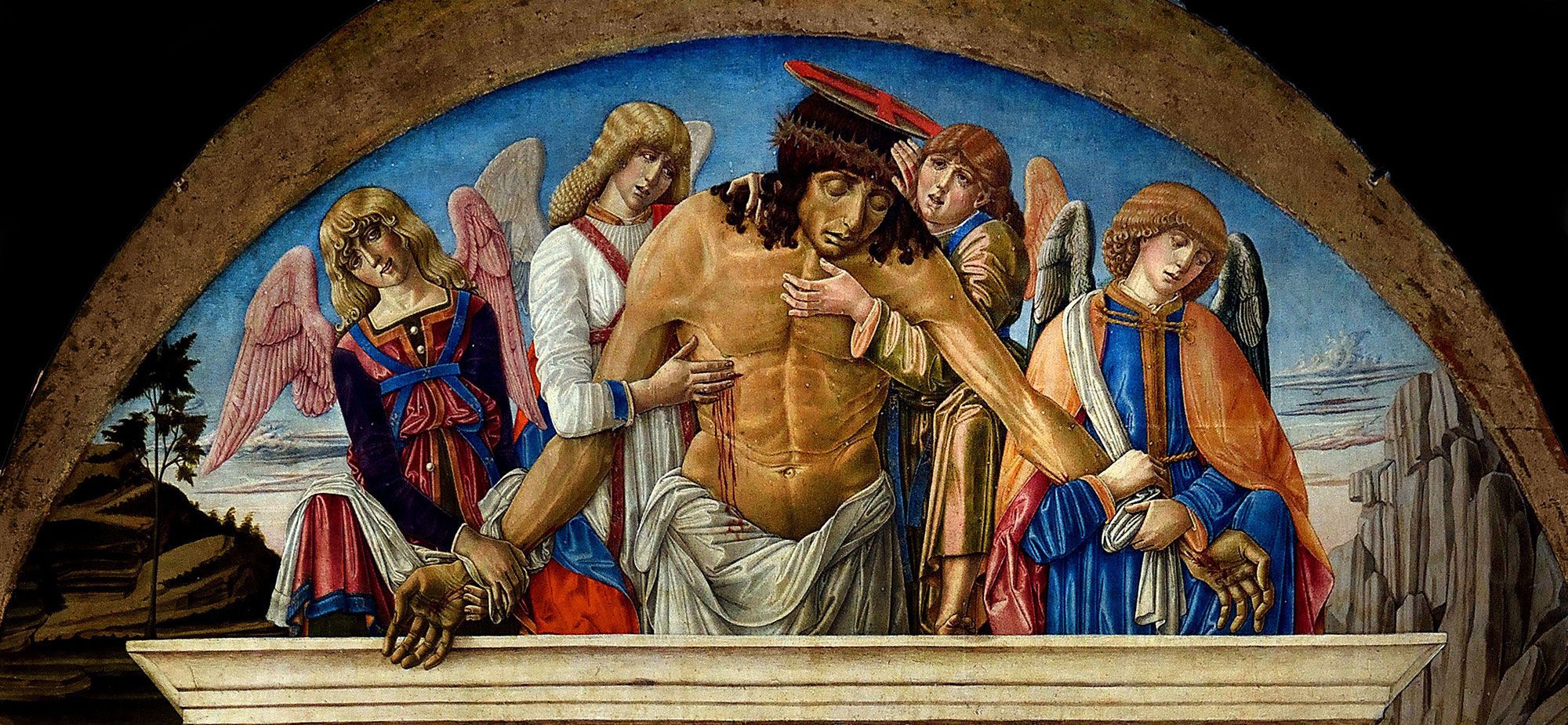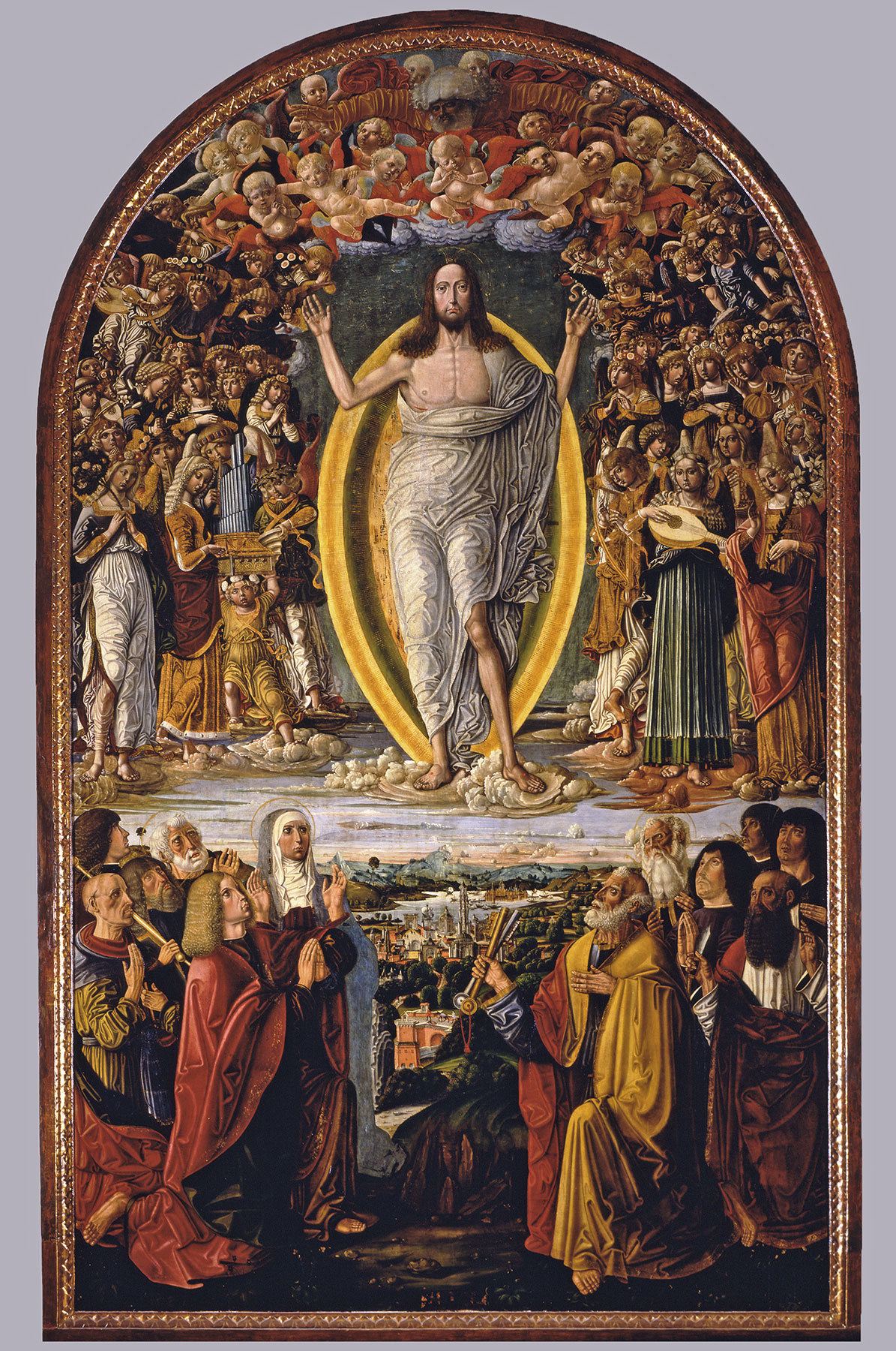 That this “new” direction in Benvenuto’s art does not represent a détente within the development of his career in the 1470s but is rather a definitive departure at a later moment is indicated by a closer consideration of the style of the painting. Meaningful comparisons to the porcelain delicacy and rounded proportions of the figures in either the Montepertuso (1475) or London (1479) altarpieces are absent here, as are similarities to either the Sinalunga Annunciation or the Voterra Nativity, both of 1470.6 The heavier and, at the same time, more elongated proportions of the figures in the Yale painting do find a point of comparison in the Borghesi altarpiece, but only with the angels supporting the figure of the dead Christ in its lunette (fig. 1). It is probable, however, that the lunette—which has been cut to its present shape and size—is not original to this structure and may be a relic of Benvenuto’s altarpiece of 1483 painted for the Bellanti Chapel in San Domenico. The same stiffer, grander proportions appear throughout paintings by Benvenuto plausibly dated to the 1480s, such as the series of frescoes from Sant’Eugenio, Siena, now displayed at the Museo Bardini, Florence (fig. 2), and they culminate in the monumental 1491 altarpiece of the Ascension (fig. 3) from Sant’Eugenio. This is clearly the period in which the Yale painting must be situated, but specifying whether it might have been conceived and executed shortly before, contemporary with, or shortly after the 1491 altarpiece is not possible, given the absence of other firmly dated works from the time.