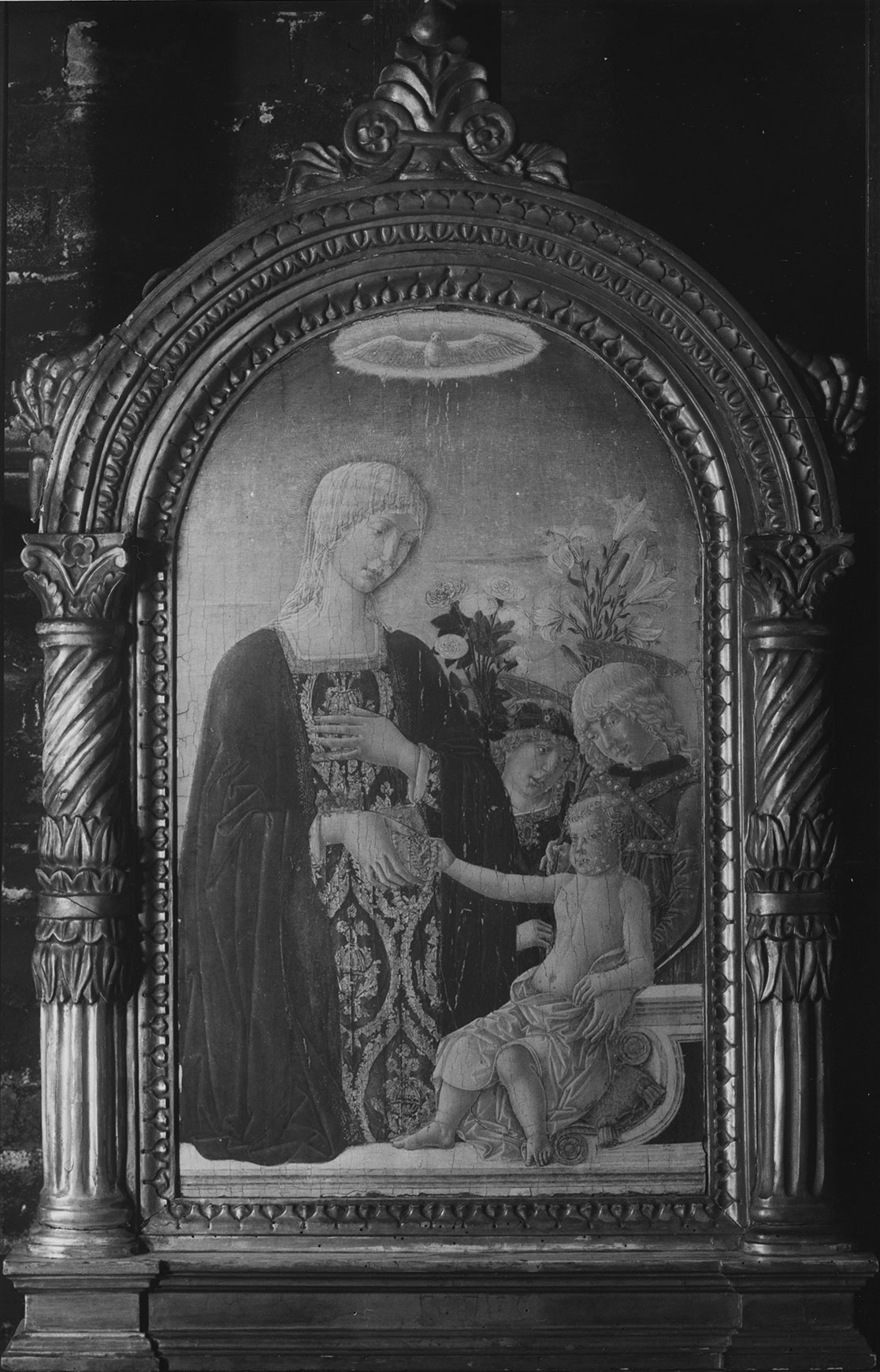 The unusual silhouette of the panel support of the Yale painting implies an idiosyncratic construction of its original frame, in which most of the outer moldings would have been nailed to it as a backboard, in a manner more commonly encountered among stucco, cartapesta, and terracotta relief sculptures than paintings. Early photographs (fig. 4) show the Yale painting in a tabernacle frame that was removed during the ill-advised cleaning of 1960 and was, apparently, destroyed. There is reason to believe, however, that although repaired and regilt this frame may have been at least in part original. Exposed worm tunnels in the panel support forming a band of damage ranging from 4.0 to 4.5 centimeters wide all around the image indicate the presence there of an engaged molding, glued as well as nailed to the backboard. Such a molding, virtually identical in profile and detail to that seen in photographs of the Yale tabernacle, surrounds the beautifully preserved and only slightly earlier Virgin and Child by Benvenuto di Giovanni in the Robert Lehman Collection at the Metropolitan Museum of Art in New York (fig. 5), although the structure of that frame was altered when it was cut away from the painted panel to permit cradling of the former. Related and substantially intact frames are preserved on a cartapesta Virgin and Child by Francesco di Giorgio formerly in the Lemmers Dansforth collection at Wetzlar, Germany, and now also in the Yale University Art Gallery (see Francesco di Giorgio Martini, Virgin and Child with Angels and Cherubim) and on a terracotta relief of the Virgin and Child by a follower of Francesco di Giorgio in the Pieve di San Leonardo at Montefollonico.7 Alessandro Bagnoli has made a case for attributing these frames to the Sienese woodcarver Ventura di Ser Giuliano di Tura, also known as Tura a Pili (documented 1488–1512).8 While not susceptible of proof, the argument carries a strong degree of plausibility. —LK