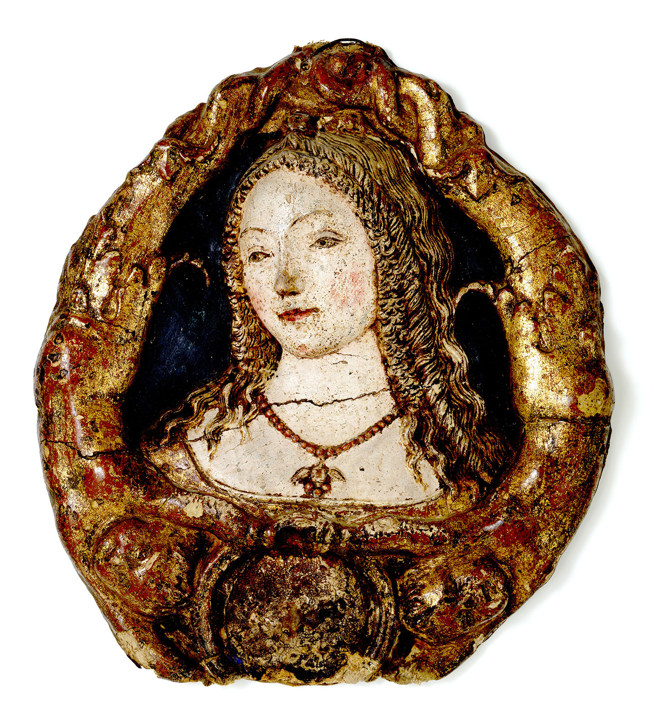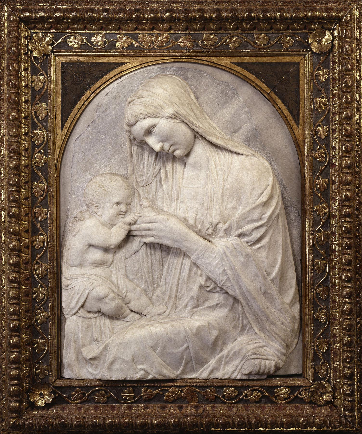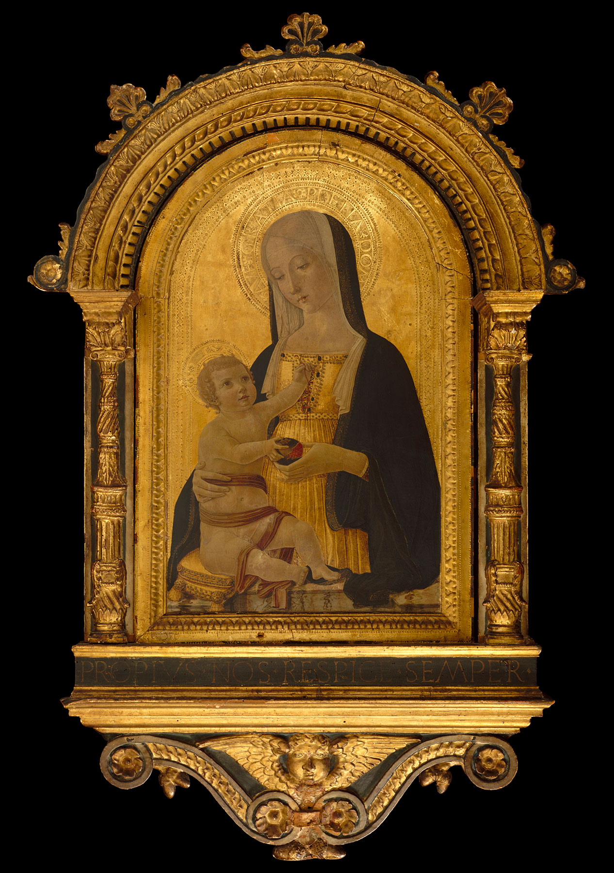 In its size, complexity of conception and execution, and astonishingly complete state of preservation, this cartapesta relief is a unique surviving object from fifteenth-century Italy. The central image shows the Virgin seated in left profile on a cloud of blue cherubim, with the naked Christ Child balanced on her right knee. She wears a blue cloak lined with green over a red and gold dress; a white veil covers her blonde hair and falls forward over both her shoulders. The Child looks out of the composition toward the right and raises His right hand in the same direction in a gesture of blessing. Hovering in the naturalistic sky, which shades from deep blue at the arched top to nearly white at the bottom, are three more cherubs supporting a garland of dark green leaves and golden fruit that is tied to their wings with pink ribbons. The lower ends of the garland are held by two angels, one peeking out from behind the Virgin’s shoulder at the right, the other standing, visible full length, looking dramatically away from the Virgin and out of the composition at the left. The frame is designed in illusionistic foreshortening to give the appearance of much greater depth than the actual cast, its shelf and heavy arched pediment painted to simulate white marble veined with gray. The arch is enlivened with moldings—pearl, rope, bead-and-reel, leaf-and-dart, and ovolo-and-dart—which are parcel gilt and highlighted with blue; it springs from oversized projecting corbels supported on two pair of blue and gilt candelabra. The antependium includes two stylized dolphins, painted in faux marble and parcel gilt, supporting a coat of arms (effaced), of which only the silver ground remains.