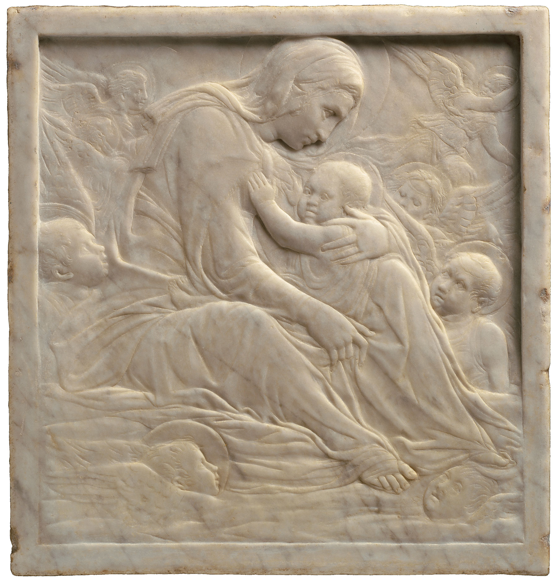 The technique of casting reliefs of the Virgin and Child that could be replicated as multiples originated in Florence in the third decade of the fifteenth century and was introduced to Siena by Donatello, one of the inventors of the process, during his sojourn there between 1457 and 1461.1 Donatello’s most astute follower in Siena was Francesco di Giorgio, who initially adapted the process, through the use of piece molds, to create elaborate sculptural decoration on wedding cassoni, a commercial specialty of the workshop that he operated jointly with Neroccio de’ Landi between 1469 and 1475. This molded decoration took two essentially different forms: shield-bearing figures cast as mirror images of each other and applied at either end of a painted narrative scene on the front face of the chest,2 or complete narrative reliefs comprising groups of two or more figures that could be reused and rearranged in different combinations on different chests.3 This second category, which also employed molded shield-bearing figures similar or identical to those in the first category, may have evolved from an earlier type of purely decorative pastiglia cassone often associated with early quattrocento Siena.4 Francesco di Giorgio’s partner, Neroccio, adapted the casting process to create at least two compositions of the Virgin and Child as a reproducible stucco relief. One, at the Art Institute of Chicago (fig. 1), exists in a unique surviving cast; the other is known in five replicas, variously in stucco, cartapesta, or wood.5 These replicas vary in size as well as medium, adding different painted details to the surface and, in one case, including five additional cherub heads cast from a piece mold. A cartapesta mirror frame in the Victoria and Albert Museum, London (fig. 2), is also correctly attributed to Neroccio and was probably designed to be reproduced in more than one example.6