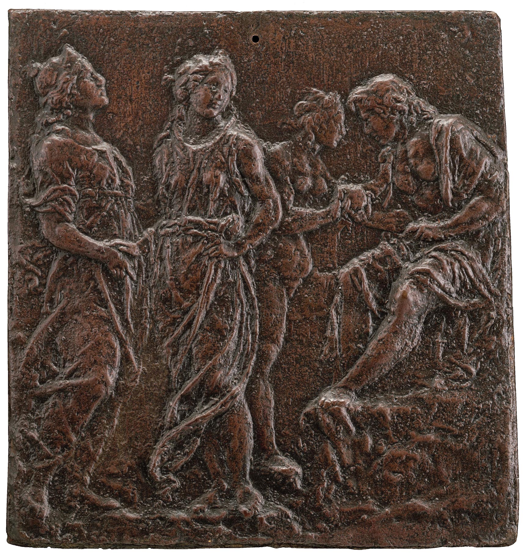 That the Yale relief was not conceived as a mechanical replica of a work in another medium—marble or bronze—is clear both from the subtlety of its surface effects, achieved by extensive recutting of the cartapesta after casting, and by the elaborate layered construction of the wood support, especially in the buildup of superimposed wedges to achieve the illusion of a projecting frame profile. The composition of the relief is directly inspired by Donatello, specifically by the marble relief known as the Madonna of the Clouds (fig. 4), now in the Museum of Fine Arts, Boston. This resemblance, and probably a tacit assumption that all of Francesco’s experiments with Virgin and Child compositions date from the first part of his career, before leaving Siena for Urbino around 1477, has led to a date close to 1475 for the Yale relief being repeated by the few authors who have referred to it. The figure style and impressionistic handling of surface detail revealed by cleaning, however, recall instead the masterful bronze reliefs Francesco di Giorgio created for the dukes Federigo and Guidobaldo da Montefeltro in Urbino in the late 1470s and the 1480s. Above all, its conception and handling resemble those of the large bronze plaquette of the Judgment of Paris in Washington, D.C. (fig. 5), assumed by consensus to be the latest of Francesco’s bronze reliefs.14 The standing angel at the left of the Yale relief, looking mysteriously and intensely out of the composition, is loosely based on the same model that Francesco devised, on a much larger scale, for the two bronze angels he cast for the high altar of Siena Cathedral around 1490. Finally, the workshop hand that aided him in pigmenting the frame and background of the relief—the painting of the Virgin and Child is clearly by Francesco himself—is unrelated to anything appearing among the workshop products for which Francesco and Neroccio can be easily recognized during the period of their partnership before 1475.