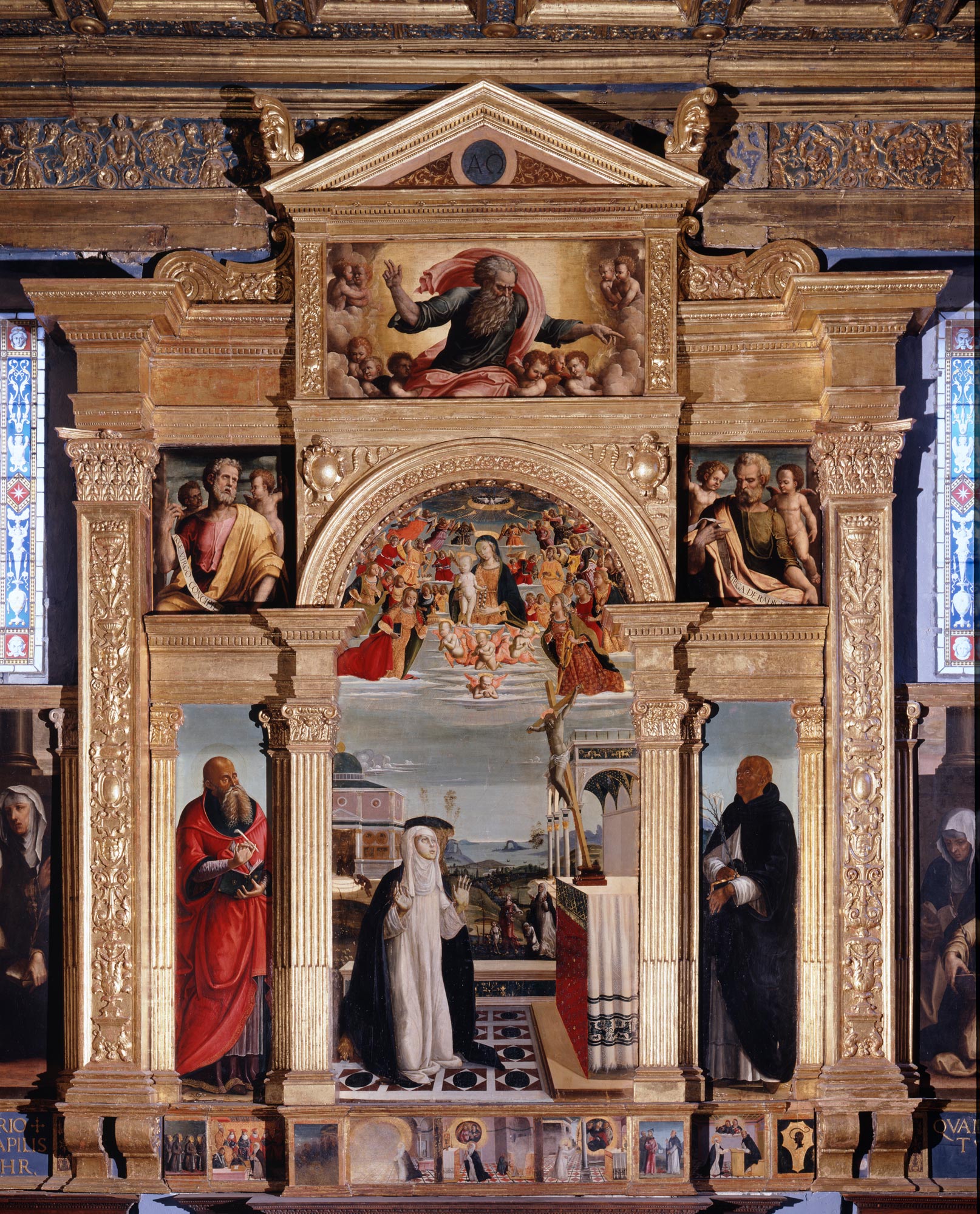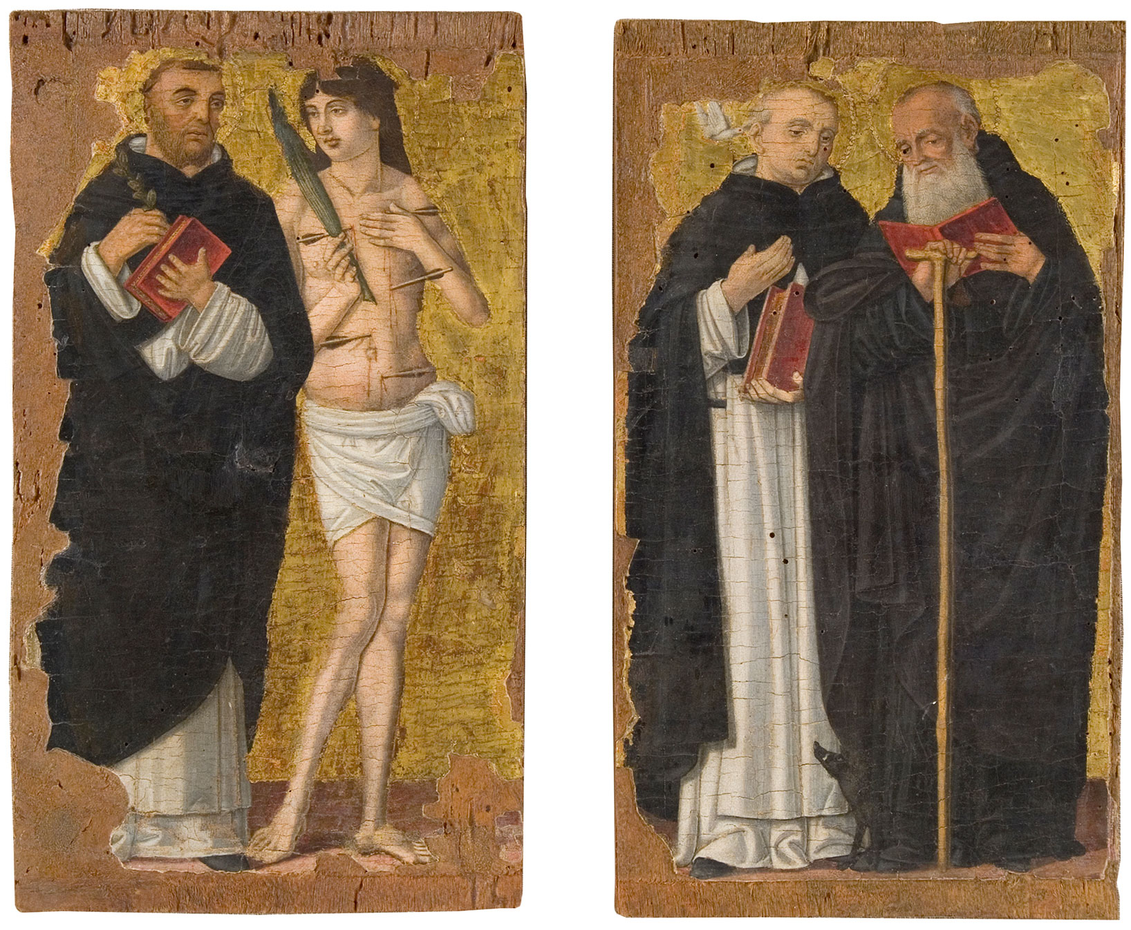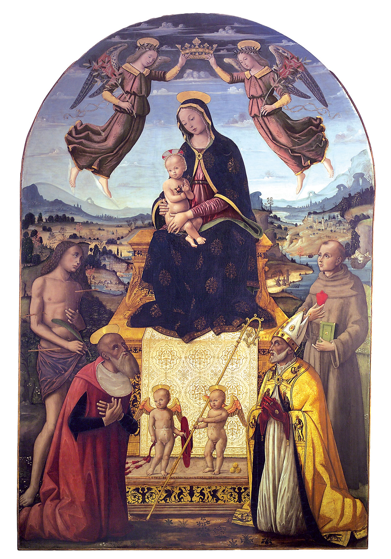 The identification of Bernardino Fungai as an artist proceeds from a single signed and dated (1512) painting, an altarpiece of the Virgin and Child Enthroned with Saints Sebastian, Jerome, Nicholas of Bari, and Anthony of Padua (fig. 1), formerly in San Niccolò al Carmine in Siena and now in the Pinacoteca Nazionale there. Securely attributed and firmly datable works advance the beginnings of his career only as far as 1496–97—the altarpiece of the Stigmatization of Saint Catherine of Siena (fig. 2) in the Oratorio di Santa Caterina in Fontebranda—and 1498–1501—the majestic Coronation of the Virgin (fig. 3) on the high altar in Santa Maria dei Servi in Siena. A number of private devotional works, chiefly small panels of the Virgin and Child with saints or angels, undoubtedly predate these but offer no fixed points for reconstructing a chronological development. Earlier still is a small group of Virgin and Child compositions that is widely understood to have been painted either by Benvenuto di Giovanni or Girolamo di Benvenuto but that must instead have been executed by Fungai in Benvenuto’s shop, probably over Benvenuto’s designs and possibly with the intention of passing for his work. These include, in addition to the present panel, a Virgin and Child with Saints John the Evangelist and James Major in San Sebastiano in Valle Piatta, Siena; a Virgin and Child in San Paolo fuori le Mura, Rome; and a Virgin and Child with Saints Jerome and Bernardino in the National Gallery of Art, Washington, D.C.4 This opening phase of Fungai’s career includes other paintings confused with Benvenuto’s studio output, such as the two small panels, probably pilaster bases from an altarpiece, showing Saints Dominic, Sebastian, Anthony Abbott, and the Blessed Ambrogio Sansedoni in the Pinacoteca Nazionale, Siena (fig. 4). Determining the full extent of this phase, either in quantity of works or in the span of time they cover, and whether it unfolded under the aegis of Benvenuto’s studio or as Fungai’s initial efforts as an independent master, depends on a clearly defined catalogue and sequence of the artist’s subsequent work, from the mid-1480s through the mid-1490s. Such a project has not yet been undertaken. —LK