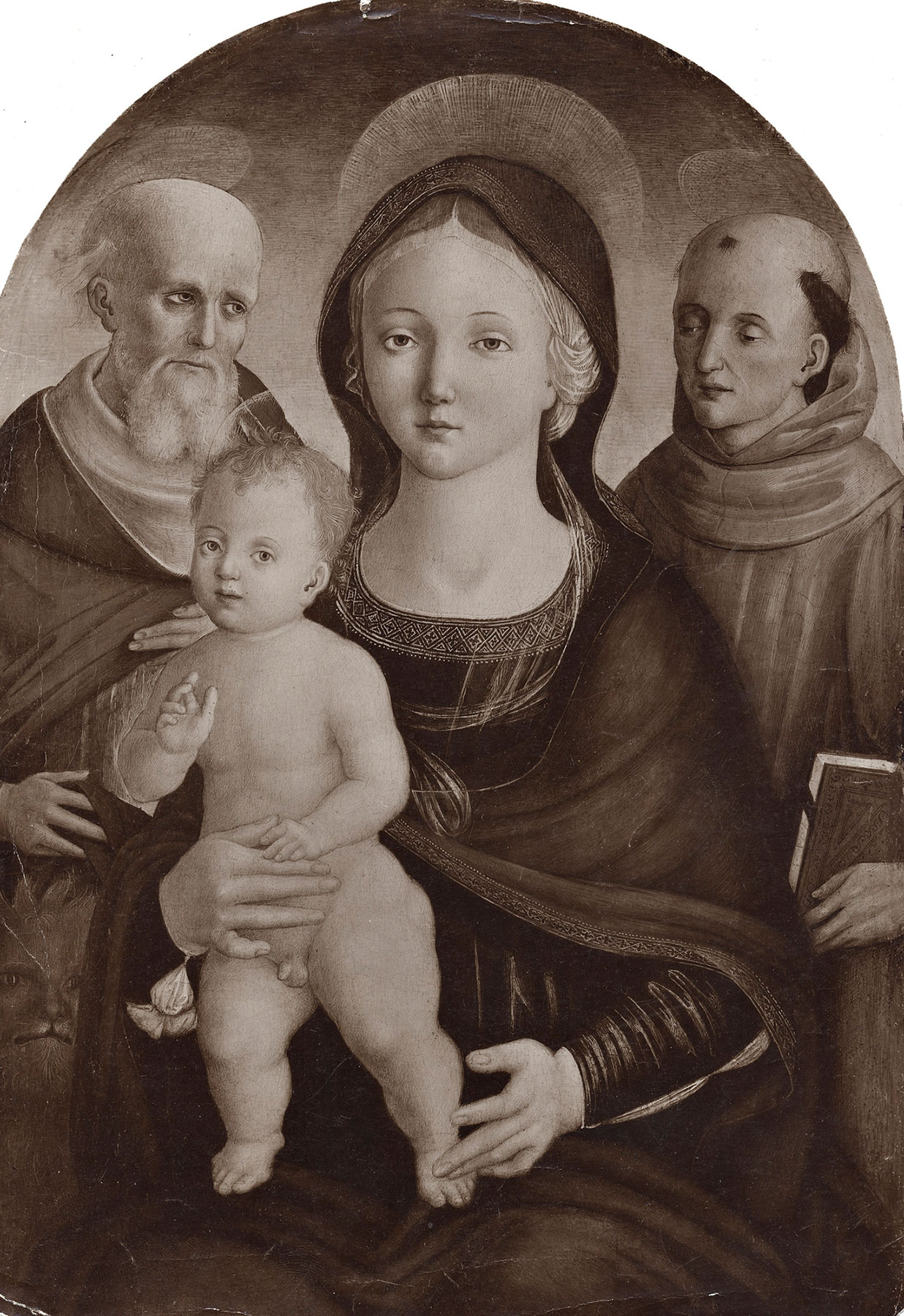 Orioli’s paintings of the mid- and late 1480s reintroduced to Sienese artists an interest in naturalism and the rational construction of pictorial space that had been almost entirely absent in local culture since the deaths of Domenico di Bartolo (1445) and Sassetta (1450) more than three decades earlier. Within the genre of private devotional paintings of the Virgin and Child with saints, the novelty of Orioli’s approach was subtle rather than revolutionary. A Virgin and Child with Saints Jerome and Francis formerly in the Goudistikker collection in Amsterdam (fig. 2),9 for example, transposes gentle and idyllic figures reminiscent of Sano di Pietro into a composition derived from Matteo di Giovanni, but it takes great pains to foreshorten limbs and hands, to justify relative scale by simulating distance behind the picture plane, and to use softened lighting effects to enhance the verisimilitude of textures and volumes. It also introduces a self-consciously animated Christ Child being gently restrained by His mother as He strides across her lap. A motif found in Donatello’s relief sculpture and among Florentine painters of the late fifteenth century but not previously in Sienese paintings—where even the most restless Child is either held in His mother’s arms or embraces her—it appealed directly and immediately both to Matteo di Giovanni and Guidoccio Cozzarelli. Matteo grafted it onto the solemnity of his paintings of the 1490s,10 and Cozzarelli assimilated it, probably at about the same time but in a spirit closer to Orioli’s example, in a series of three closely related paintings, including the Yale Virgin and Child with Saints Margaret and Catherine of Siena.