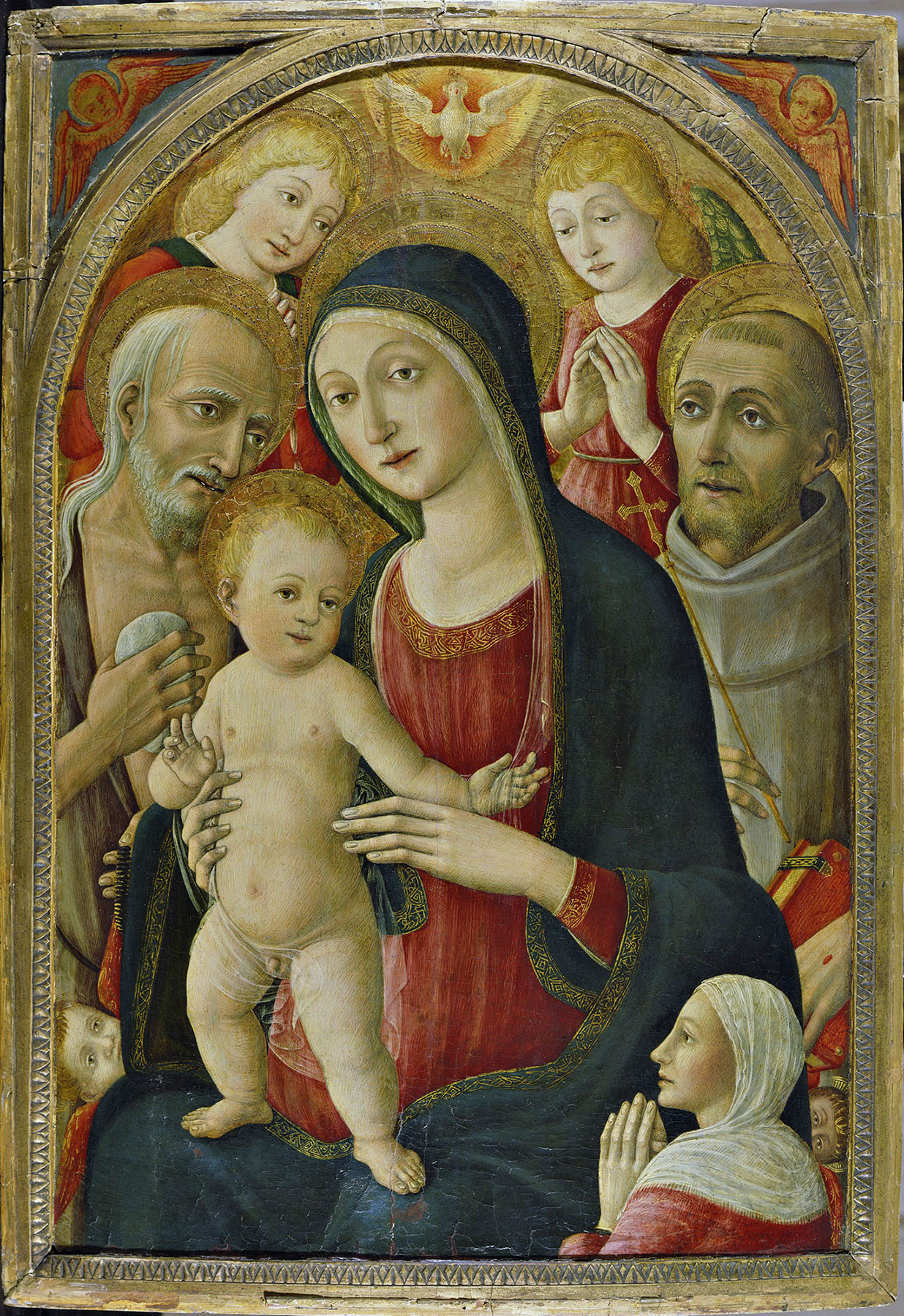 What is almost certainly the first of the three paintings is also the most elaborate (fig. 3). Formerly in the Van Gelder collection at Uccle, Belgium, near Brussels,11 it shows the Virgin seated on a throne of seraphim (symbolized by two seraph heads in the lower left and right corners of the panel), with Saints Jerome and Francis, two angels, and the dove of the Holy Spirit. A bust-length donor in full profile is cropped at the lower edge of the composition at the right. In this painting, the Child strikes a pose leaning back toward the (viewer’s) left and reaches forward across His mother’s chest to finger her veil. To create the Yale painting, Cozzarelli initially just reversed the cartoon for the Child’s legs: an X-radiograph (fig. 4) shows a first position for the Child’s head identical to that in the Van Gelder panel. The idea for the Child’s halo in this position is still visible, engraved in the gold ground and along the edge of Saint Margaret’s throat in the Yale panel, as are numerous drawn pentimenti, due to the sadly reduced opacity of the paint layers. The final iteration of the theme, a painting now in the Virginia Museum of Fine Arts in Richmond (fig. 5),12 probably painted close to the turn of the sixteenth century, follows the final version of the Yale painting fairly closely, converting the figure of Saint Margaret into John the Baptist and moving both saints slightly further back to open a greater volume of air between them and the Virgin, closer in this respect to the lessons of the much-admired Pietro di Francesco degli Orioli. None of these three images is a slavish repetition of a borrowed cartoon. Each is reconsidered to complete the logic of the small changes it introduces, typical of the thoughtful, if modest, efforts of the last generation of Sienese quattrocento painters. —LK