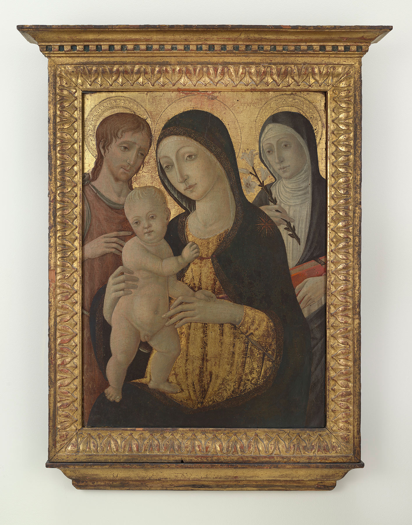 A typical example of Guidoccio Cozzarelli as a painter of domestic objects of devotion, this work was first published with that attribution by Raimond van Marle in 1931, but Maitland Griggs had already received confirmation of this identification from F. Mason Perkins (ca. 1926) and Bernard Berenson (1927).1 Berenson reiterated his attribution to Cozzarelli in the 1932 edition of his lists, while Richard Offner and John Pope-Hennessy demurred, the latter thinking it a product of Cozzarelli’s workshop and the former positing a Sienese contemporary imitating Cozzarelli’s style.2 Offner and Pope-Hennessy may both have been responding to the repainted state in which the picture was known prior to 1957 (fig. 1); photographs recording its appearance at that time bear all the hallmarks of a heavy-handed intervention by Icilio Federico Joni, perhaps undertaken for its first recorded owner, the dealer Carlo Angeli.3 This had been removed by the time Seymour catalogued the painting as shop of Guidoccio, with the inexplicable comment on its condition as “on the whole good; rubbed but showing no serious losses.”4 Federico Zeri and Carl Strehlke concurred in the attribution to Cozzarelli.5 Despite the ruinous condition of the paint surface, there can be no doubt that this attribution is correct.